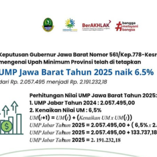 Pemda Provinsi Jawa Barat mengumumkan Upah Minimum Provinsi (UMP) Tahun 2025 naik sebesar 6,5 persen, dan Upah Minimum Sektoral Provinsi (UMSP) naik 7 persen. Kenaikan tersebut sesuai dengan Peraturan Menteri Ketenagakerjaan (Permenaker) Nomor 16 Tahun 2024.